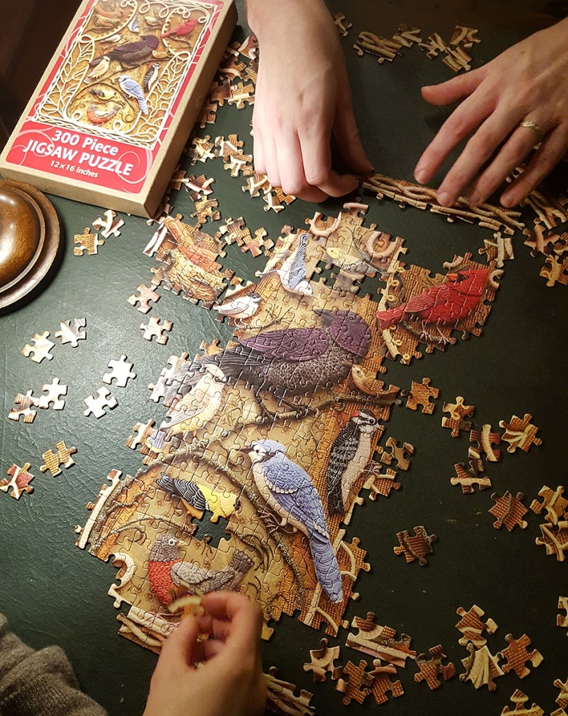 One end of the old oak table served as a work bench where I sawed tree branches and drilled holes to screw them to wooden bases.