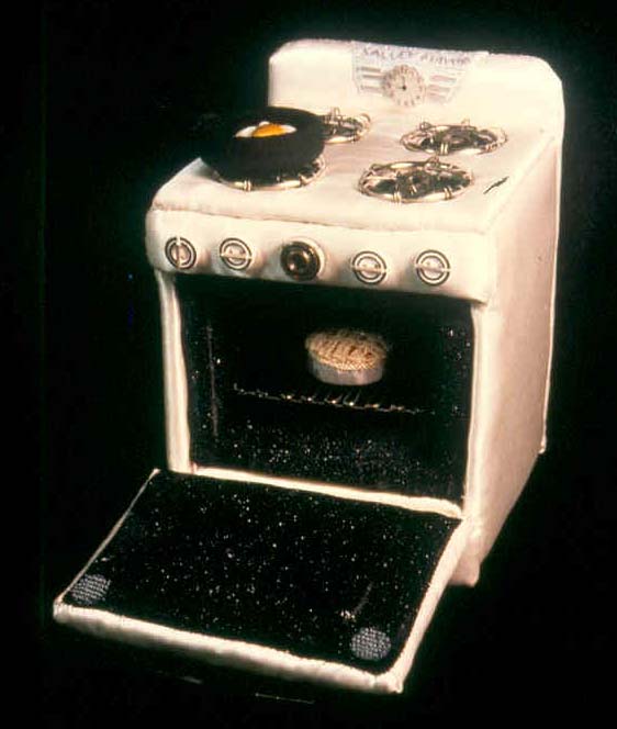 I made this soft sculpture stove 30 years ago, the first year out of art school. It is made with white satin,  covering a padded cardboard structure. I remember spattering paint with a tooth-brush onto the black fabric which lines the inside of the oven. I can see velcro circles on the oven door. The oven rack is made from hair pins, the knobs from buttons and the clock is the face taken from an old wrist watch. It looks like the burners are key rings fashioned with hooks from hook-and-eyes. I don’t remember what the frying pan is made from, but it must be cloth as that is my material of last resort. And the pie crust lattice is likely made from kid leather. This stove has a refrigerator to match, which I’ll show another time.
