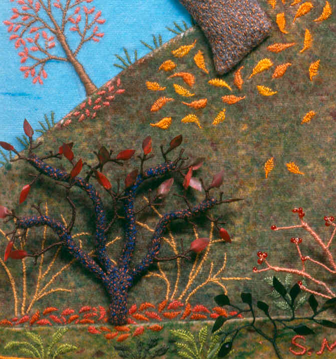 The bush trunk is wool covered wire and the smaller wire branches are wrapped with embroidery floss. The border is made of upholstery fabric, with all of the embroidered edging done by hand. I used to do a satin stitch with the sewing machine, but found it to be too flat and mechanical looking.
