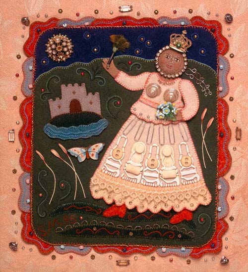 I’m always on the lookout for small interesting objects that can be sewn down and I liked the pattern created with the garters lined up. The figure started out as a bride, but evolved into a queen when she was crowned with a bejeweled pin.