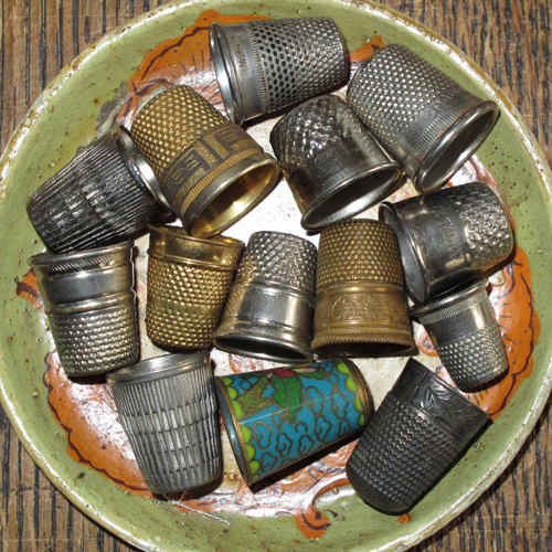 This collection of sewing memorabilia has come my way via grandmothers and great aunts. Inside the Queen Marie needle book are several packs of gold and silver eyed sharps. Don’t you just love the idolized cover scene of 3 generations sewing together? I’ve used some of this rick rack and these hooks & eyes make hinges and door handles in my artwork. And, call me old-fashioned, but I always wear a thimble.