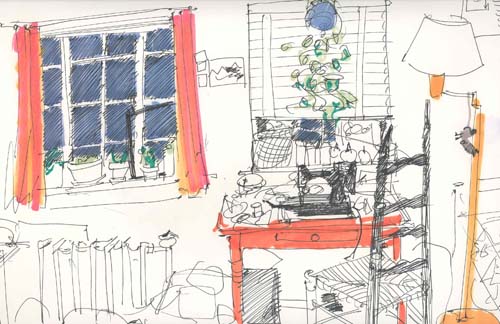 The table was an old thing of my grandmother’s that I painted orange. It’s still very much in use in my studio today. I got my old sewing machine out of storage to take its picture.  It runs forward and back and is  good for stitching small things.