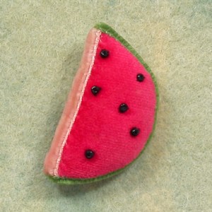 Some of the pins like the cat and the watermelon have a cardboard shape inside to give them stability. I’d sew a little pocket, turn it right side out and slip the cardboard in, put in some stuffing and sew up the pocket.