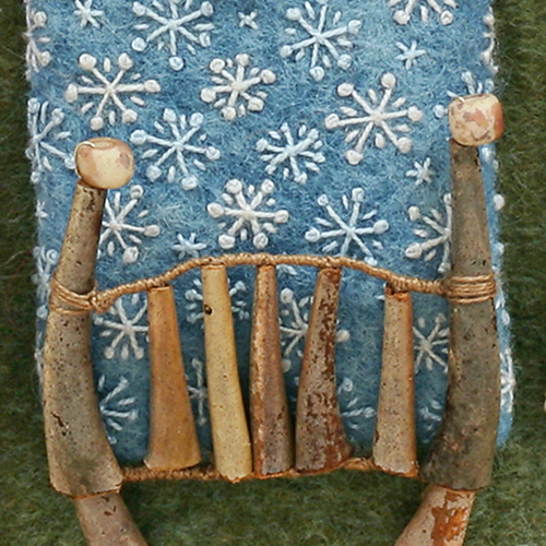 This snowflake covered bed spread is part of an illustration from Pocketful of Posies: A Treasury of Nursery Rhymes. The bed frame is made from some hollow dried plant parts, maybe thorns, with the sharp points cut off. I bought them a long time ago in a bead store. The original illustrations will be shown in a traveling exhibit when the book is released next September. Find out about it here.