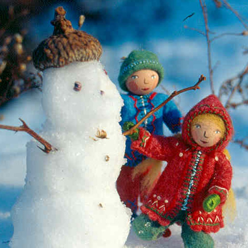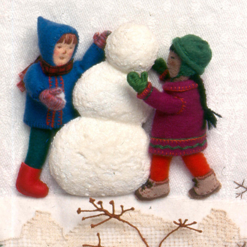 The next scene is from the illustration for the poem “Snow”, which is in the poetry anthology, You and Me: Poems of Friendship. The snowman is made of felt, painted with an acrylic based bumpy liquid medium. In the background is an old linen tablecloth.