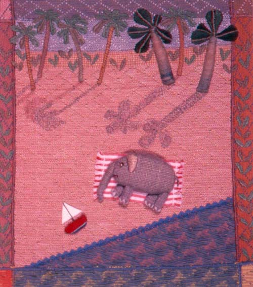 I started making what I called “fabric relief” sculptures, which were figures and props sewn to cloth backgrounds. I guessed that if my work was hung on the wall, it would be more readily accepted as “art”. I also thought that bas-relief work would be easier to photograph than sculpture in the round. “Mother and Child” was an early fabric relief sculpture that I made with fabric-covered and stuffed cardboard shapes on a pieced and embroidered fabric background.
