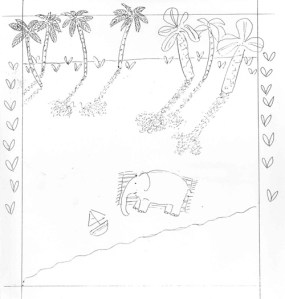 We decided to work together, and I made a sample illustration of Savi, the baby elephant, alone on the beach, with the banana trees casting long shadows. I knew that an editor would want to see just a sample of my work, not the complete set of illustrations. Picking a book size and designing the page layout comes later, after a contract is signed.