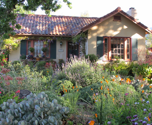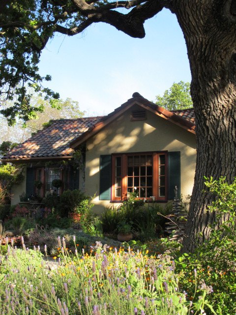 Last week I was in Ojai, California, staying at the wonderful Oaks at Ojai Spa. After a long hard winter spent mending my broken wrist and concussion, it was wonderful to eat healthy food and excercise in a beautiful place. I’m feeling rejuvenated and like myself again. It’s as if I went away for “the cure”.  One morning, we went for an early brisk walk around Ojai and saw this most adorable house with a live oak in front. After we returned to the spa, I grabbed my camera and rushed back to take pictures in the early morning light.
