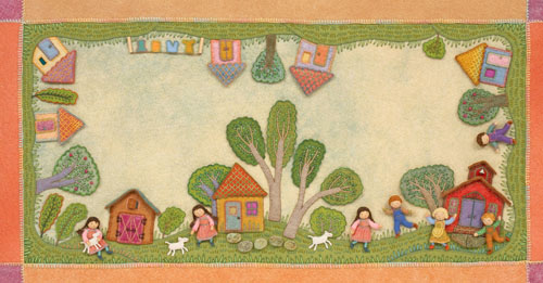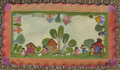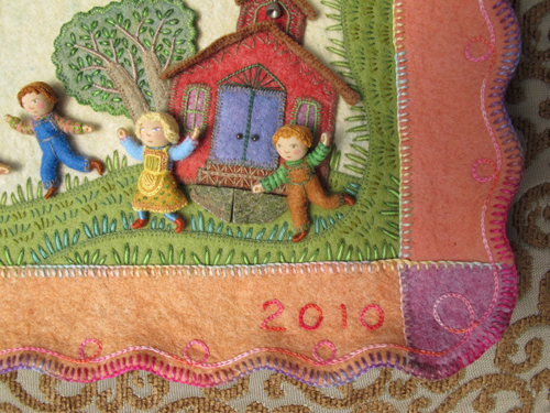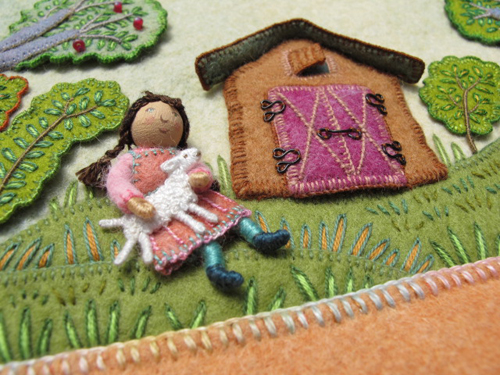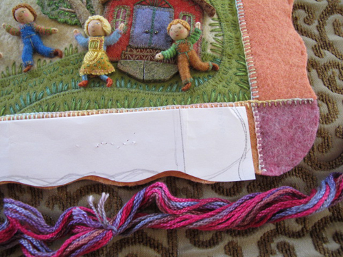 The pictures now need to be given borders and mounted on stretched backgrounds before being framed under glass for the traveling exhibit. The illustrations were photographed a year ago for reproduction in the book and now can be reworked for their 2nd life as framed pieces of original art. I just finished the border on the double-page spread for the rhyme, “Mary Had a Little Lamb”. There was already a felt border, but I needed to finish the outside edge. I made a scalloped pattern and cut around the outside so that the corners were rounded.