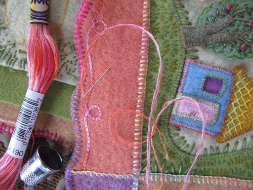 Then, with some variegated cotton thread (Watercolours by Caron), I sewed a blanket stitch around the curved edge.  I added a decorative curly-cued chain stitch made with 2-ply variegated embroidery floss (DMC).