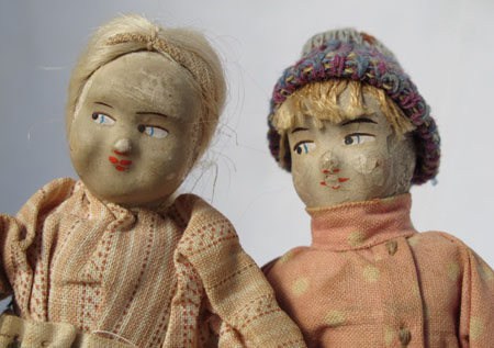 They’re doll house size, about 4″ tall and have cloth wrapped wire limbs. The heads are painted plaster and the girl has a braided white blond wig. I remember playing with them as a child and always loved their yellow crocheted booties. The clothing is crudely made, but the their delicate features, well made heads, wigs and shoes are examples of fine craftsmanship.