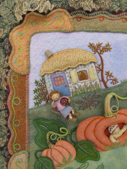 I added a dark brown rick rack around the outside of the felt border to help separate it from the background upholstery fabric. This shows Mary at the cottage door and Peter the pumpkin eater’s wife in a pumpkin.