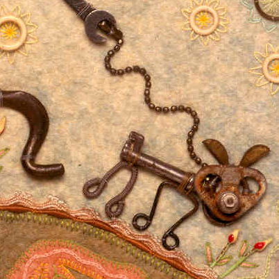 This little dog is made from a key, hook eyes and other found objects. See an earlier post about the whole piece, “Walking the Dog”, here.