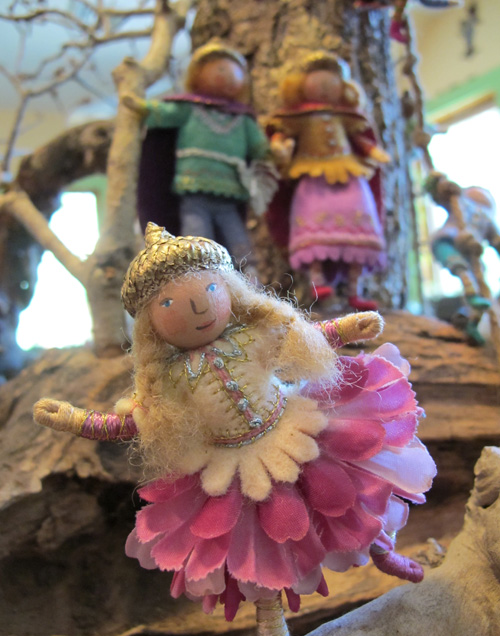 Some years ago when I worked at Borders I made a few Wee Folk from the patterns I bought when I met you in Topsfield at my Needlecraft Guild. I found a beautifully illustrated book cover that I stuffed into my mailbox (a cube about 6″x6″) for a backdrop of scenery and made a little swing for one of the tiny folks. The other two were positioned around the one on the swing. It was enchanting and got a lot of comments from coworkers.