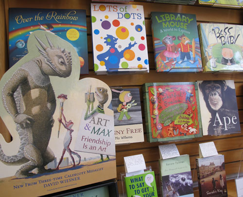 Out front, my book was in good company, next to a card board display of David Wiesner’s new book, Art and Max. David and I were both illustration majors at RISD, class of ’78. He was quiet and serious, but had a bold, determined side. I remember a mural he painted on the wall in the house he shared with some friends of mine. It was a huge copy of one of Henri Rouseau’s fantasy jungle scenes. I saw David at a RISD reunion a few years ago and was happy to see that he was still as kind and friendly as he’s used to be.