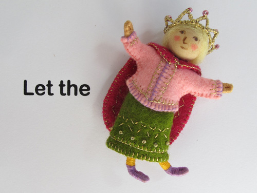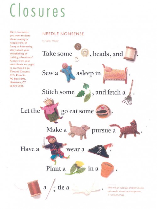 This rebus was a fun project I did for Threads Magazine about 10 years ago. I wrote  the verses and made the figures and props which were photographed and shown in the magazine’s Closures section.