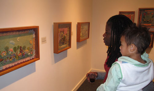 Last Saturday, the Danforth Museum in Framingham, MA, had an opening reception for their new exhibits, including my show in the children’s gallery. The original fabric relief illustrations will be displayed here until January 23rd, 2011. I really like the way they hung the artwork, clumped together in tight group-lets, with one above the other. That way they could fit more pictures in the space – 45 out of the 51 illustrations from my new book, Pocketful of Posies.