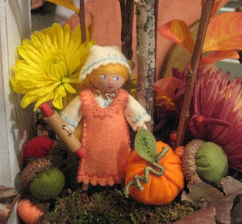 I like they way she captured the spirit of Thanksgiving by giving this woman a rolling-pin.  The dolls look comfortable in their natural environment, surrounded by moss, flowers and branches. Great job,  Shirley, and thank you for sharing a part of your Thanksgiving celebration!