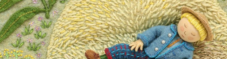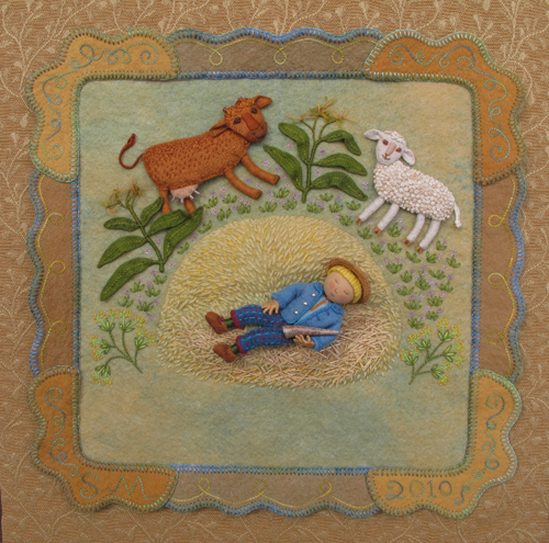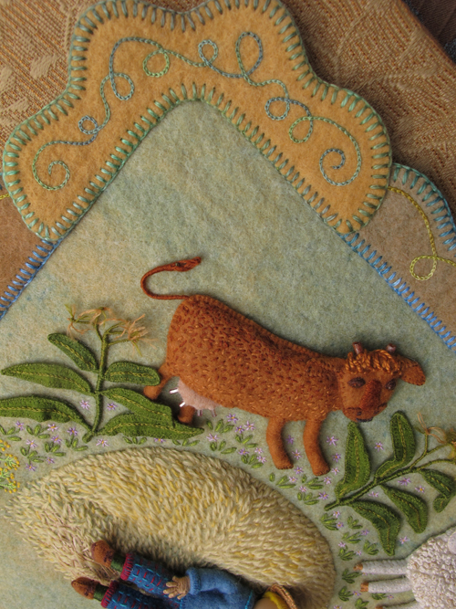 Here is the original fabric relief illustration for the rhyme, Little Boy Blue, from my book, Pocketful of Posies. The embroidered piece is first mounted on a foam core board for the photographer. Afterward, I stitch a felt border, remount, and frame each piece, making it ready to hang.