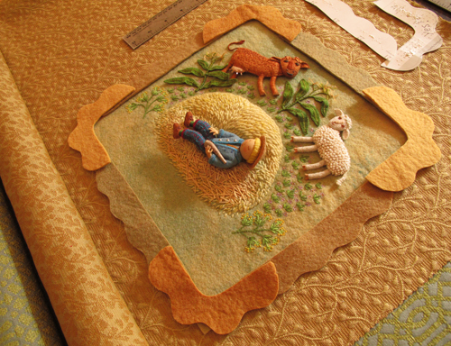 The haystack is padded with wool stuffing and the texture is stitched with tapestry wool, with real pieces of straw sewn in, too.