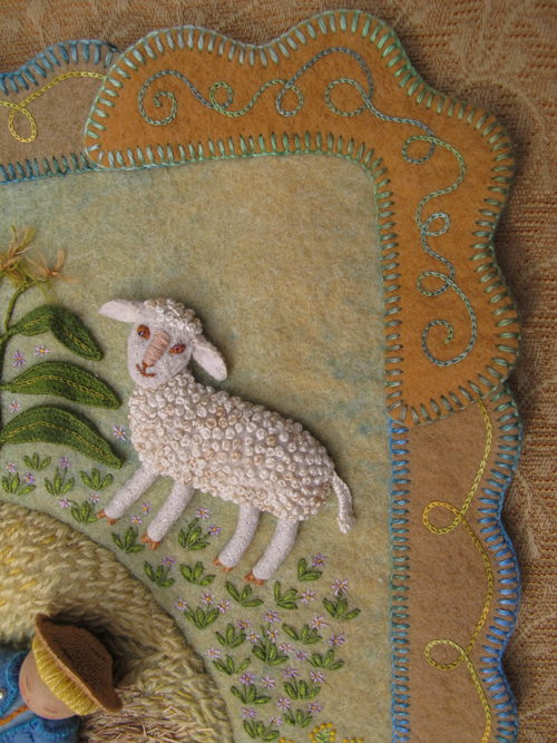 Sheep are so fun to make, with their curly fleece. Yes, these are all french knots, but they are spaced out a bit, compared to the dense knots in the lambs from my Mary Had a Little Lamb book. (see lambs here)