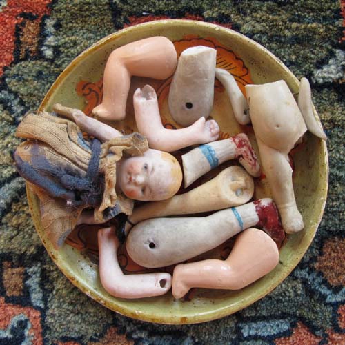 6. I’ve never heard these dolls referred to as “flapper” dolls, but rather as Kewpies. Kewpies weren’t just nearly bald baby dolls…they came in all forms. I am also a doll collector going back to the age of eight, when my grandmother would bring me a doll from each country she and my grandpa had visited. I adore the sweet, innocent look of the blonde baby doll in the bowl of doll parts. She is not a Kewpie…they have a very distinctive big-eyed look. I think she may be worth restoring.