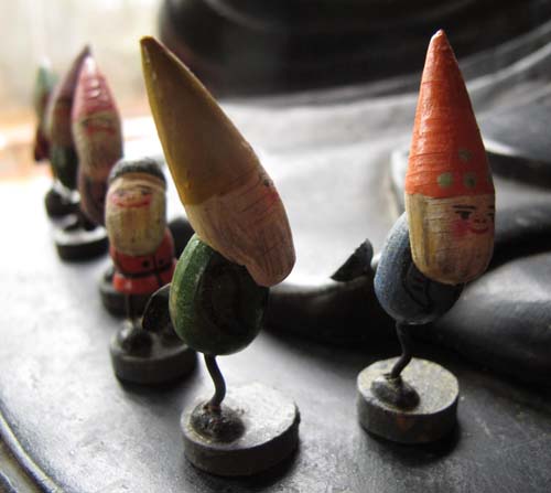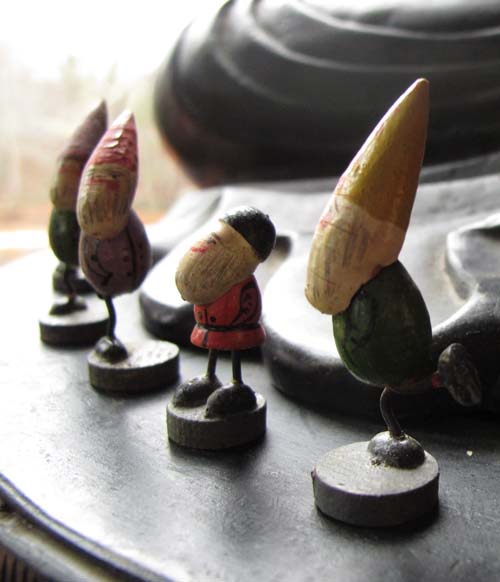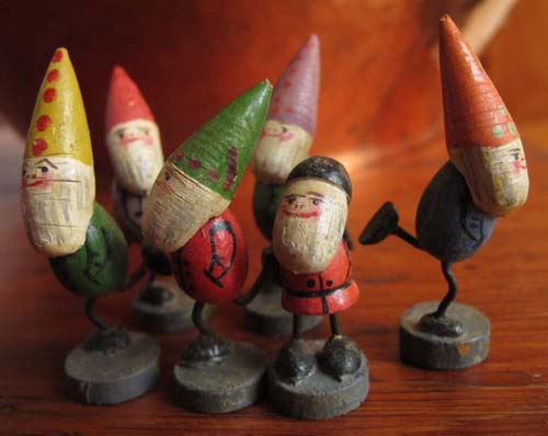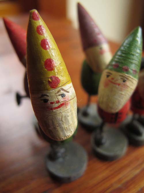 This special group of wooden gnomes came from my husband’s family. I love unpacking them at Christmas time because they look ready to jump out of the box, like northern European versions of Mexican jumping beans.