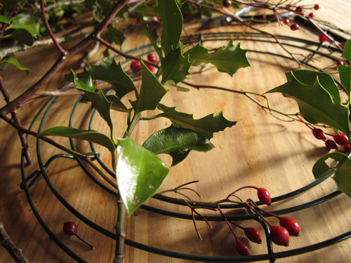 I used green wire to tie the holly and winter berry branches to a wreath form.