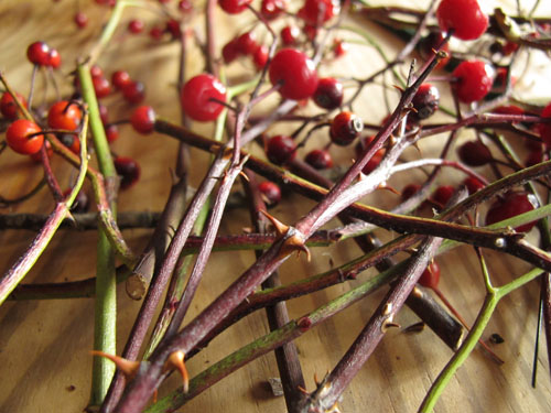 So beautiful. Love the gray-brown of the first picture with the shots of red from the bike and the wreath supplies. I saw a host of robins devouring red berries on a gray tree the other day and this puts me in mind of that. Looks like your wreath was worth all the pricked fingers (good thing you didn’t come across a spinning wheel from “Sleeping Beauty” while out gathering π