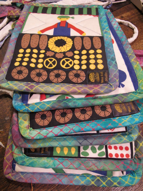 Pot holders are so simple to make and it’s a good way to use up scraps of loud fabric that don’t match anything. I first pick out some fabric from my stash–this time some shop keepers, with a line of paper-doll chain style shoppers. I’ve had this fabric sample for years and can’t remember where it came from. I also included some checked batik fabric and some favorite 40-year-old blue Mari Mekko scraps.