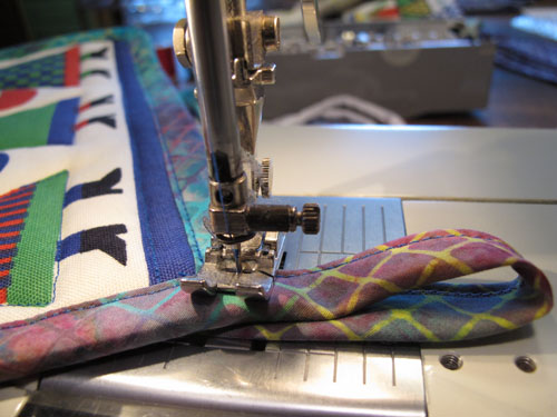 I cut the batik fabric on the bias and sewed several lengths together  to make tape for the edging.