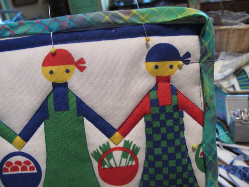 Pot holders are so simple to make and it’s a good way to use up scraps of loud fabric that don’t match anything. I first pick out some fabric from my stash–this time some shop keepers, with a line of paper-doll chain style shoppers. I’ve had this fabric sample for years and can’t remember where it came from. I also included some checked batik fabric and some favorite 40-year-old blue Mari Mekko scraps.