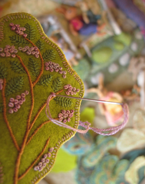 There’s been lots of activity in the studio since the valentine pilot gave an aerial tease of the new piece I’m currently working on. It now has a name, thanks to my husband Rob, who called it Rabbitat after I told him I was making a habitat for rabbits. This is not an illustration for a book, but a stand alone fabric relief picture. I’m still sewing parts of the scene, like this lilac bush.