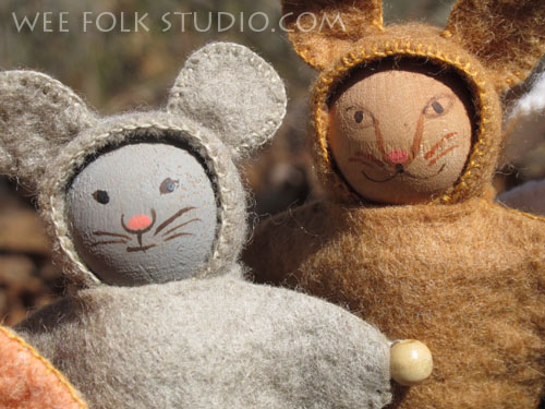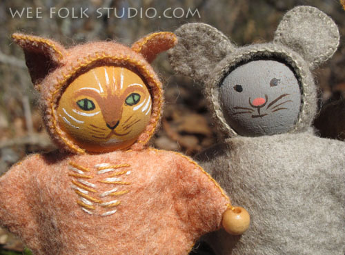 They are made with wooden forms that have a simple dowel on the bottom, with a turned ball on the top. You can find the wood shapes here. At about 2 inches tall and similar to finger puppets, these can stand up by themselves.  The small wooden bead “paws” are a choking hazard, so they shouldn’t be added if a young child plays with them.