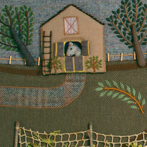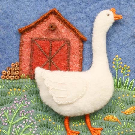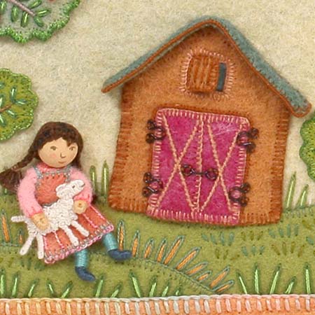 These barns are on the title page of the first edition of Mary Had a Little Lamb from 1995. At this point, I sewed everything by hand and no longer used a sewing machine. The “snow” is an old linen table-cloth.