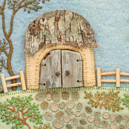 Houses are my favorites, but I also love to add barns my scenes. This first one is a detail from Picking Peas, which I made in 1986. I used the sewing machine to applique the door and window, but hand embroidered leaves along the ribbon tree branches. See the full fabric relief picture on this post.