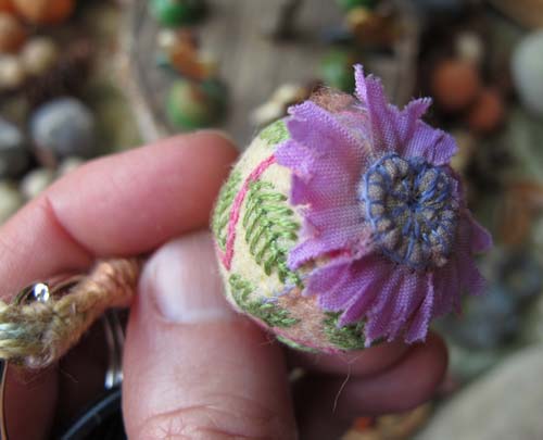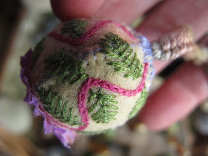 The felt pieces fit around the bead like a beach ball. I used my favorite leaf stitch after the bead was covered.  Sorry this isn’t a tutorial, but I’ve sworn off writing directions! This kind of thing could also work as an ornament.