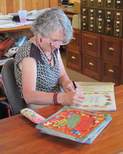 The finished and framed Rabbitat picture was displayed on an easel and about half of the original fabric relief illustrations from Pocketful of Posies lined the library’s main room on top of the book shelves. I’ve had to take away the artwork, but one piece will remain for a few months, the illustration from There was an old woman who lived in a shoe. People loved seeing the Rabbitat film (read posts about it here) and commented that it gave them a clearer insight and appreciation of what I do. I haven’t had time to put the film on this blog or my website, but the filmmaker, Daniel Cojanu is showing it on vimeo here
