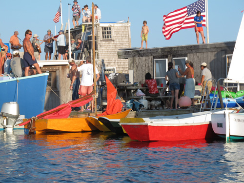 As we were heading in from our mooring in Great Harbor we couldn’t help but notice  some house boats had rafted together in a clump, with people all over. They were celebrating a friend named Kenny’s 60th birthday, Woods Hole style.