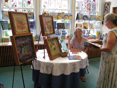 Congratulations to Cindyfelter, Nancy K. and Carlie H. , who are the winners in the  Pocketful of Posies   poster giveaway. I will be sending e-mails to notify each of you, so you can send me your mailing addresses. Here’s a photo of Saturday’s book signing at Eight Cousins Bookstore, taken by the owner Carol Chittenden. Despite the impending storm, a few people showed up, including my doctor, who is a stitcher himself! They are celebrating 25 years in business and are the only bookstore left in town. We’ve had  agreat relationship over the years and I’m always willing to go in and sign a book on request.