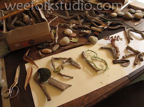 I formed the letters with driftwood, adding embroidered felt vegetation to complete the shapes. One “B” features a roving, rounded vine made of felt covered wire. The thorns are thread wrapped wire.