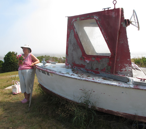 I brought Barbara some dahlias from my garden. Their old boat sits on the lawn near their house.