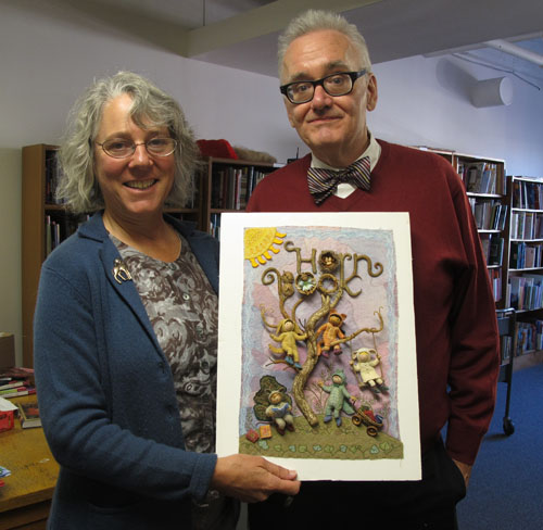 Last Tuesday, I visited the Horn Book Magazine’s office in Boston. I went to pick up my original artwork, which will be on the cover of their January/February issue. Designer Lolly Robinson showed it to me on the computer and it looks great! Editor in Chief Roger Sutton and I held up the original for a snapshot before I took it back home.