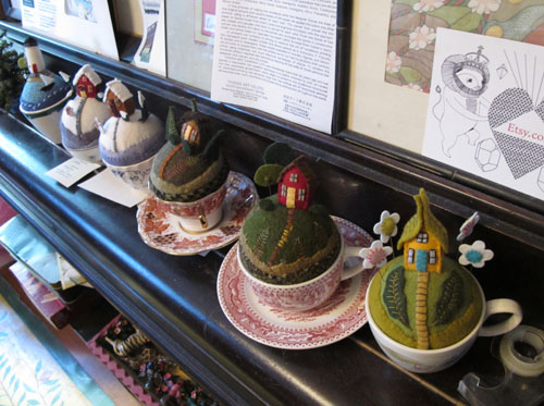 I visited the talented doll and pin cushion maker Mimi Kirchner in Arlington, Mass. As you may remember from previous posts, Mimi inspired me to start this blog. This is the first time I’ve seen her new studio since she moved in. It was good to see that she has totally taken over the room. Unlike her previous quarters in the attic, she has heat and windows to look out of! Like her attic space, it’s chockfull of materials and inspiring objects. Downstairs, her inventory of Wee World pin cushions in tea cups were lined up on the piano.