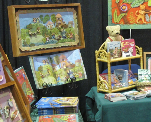 We had a good day on Saturday at the RISD Holiday Sale. It’s been five years since I had a booth there, so it felt good to once again be among the 200 odd alumni who set up their wares. Since I don’t make kits or dolls to sell anymore, I brought books to sell. My husband, Rob was relieved that my setup was simpler than in the past. I used to make him haul twisty trees on heavy stands, but not this year. I hung up a large blowup of the cover of Pocketful of Posies, which my editor and the sales staff at Houghton Mifflin passed on to me. We were busy, which meant that I couldn’t take off and peruse the other isles. There’s always an eclectic selection of stuff at the RISD sales. Alumni from almost every department are represented; jewelry, furniture design, ceramics, printmaking, illustration, glass, textiles, industrial design, etc. Several people who follow this blog came by, including RISD illustration alumnus Ingrid Lavoie, who had her own booth with cut paper items. We talked about how a large percentage of illustration majors never work in publishing, but end up using a variety of art forms, and that their work usually has a storytelling element.