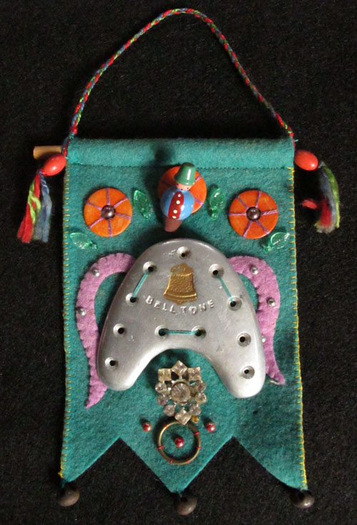 I saw the new movie, The Artist (see the trailer here) the other night and walked out of the theater thinking about tap dancing, which is featured at the very end. That got me thinking about my mother’s life as a girl during the movie’s time period (late 1920’s-early 30’s). She took tap dancing lessons and I still have her Bell Tone taps, which I sewed into this little hanging I made years ago. It’s a forerunner to the wedding banners I’ve been making lately, which you can see here.