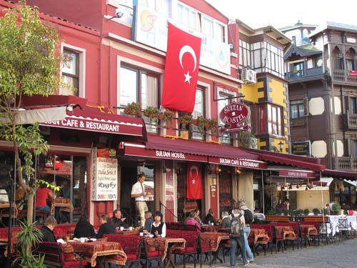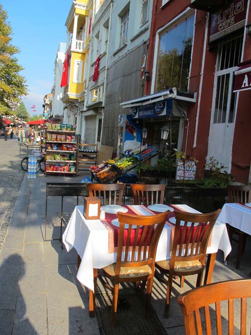 And saw many places to sit and eat outside. Yes, those are carpets on the tables. Our hotel was on this street.