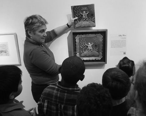 Local photographer Mark Chester took this B & W shot of a school group being shown the original fabric relief illustration for “Little Miss Muffett”. She held up my book, open to the printed picture and told the children how my work was used as an illustration. The tour leader is the Cotuit Center’s educational coordinator, Lenore Lyons. Mark had a photo in the show from his delightful new book of paired photographs, Twosomes. Thanks for sending over the photo, Mark! I’ll probably include Miss Muffett in the Mashpee Public Library display during the month of May and this July and August at the Mahopac Public Library, Mahopac, New York .