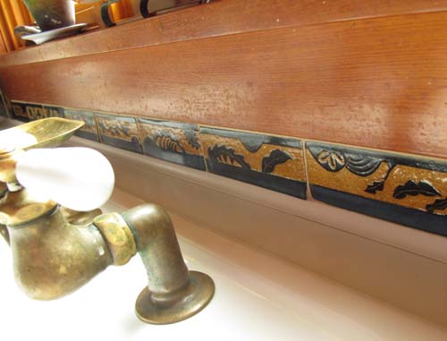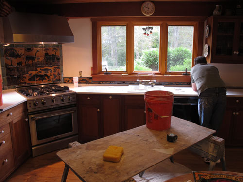 Tessa encouraged me to decorate some tiles, too, so I carved the narrow back splash strip under the windows. We spent a few enjoyable afternoons carving together in her Woods Hole studio.