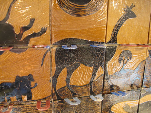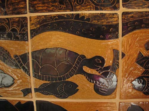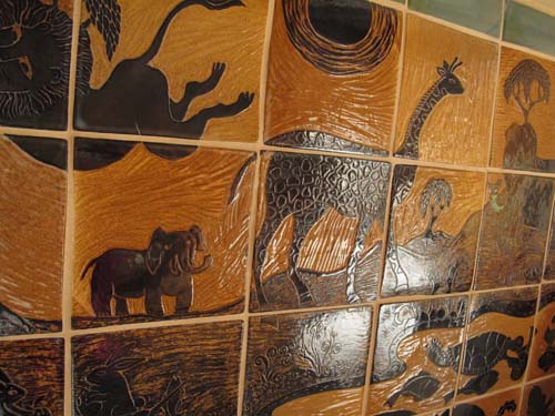 We asked Tessa to design a landscape and seascape with animals. I had admired her pottery for years and we gave her the freedom to create her own menagerie.  Before they were installed, we laid out the pieces on our dining room table.